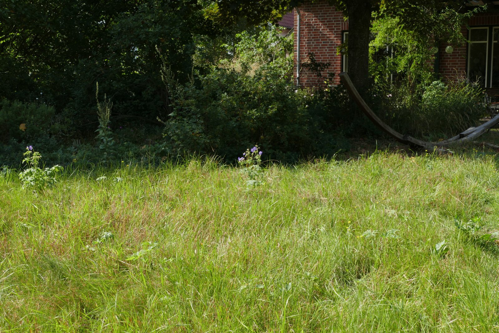 Bei unserer Wiese wandern allmählich die Wiesenstauden aus den Naturgarten-Beeten ein: Wiesen-Storchschnabel (Geranium pratense) wie im großen Bild oder die Wiesen-Witwenblume (Knautia arvensis) wie hier neben Dost (Origanum vulgare), der in einem trockenen Jahr auch eingewandert ist.