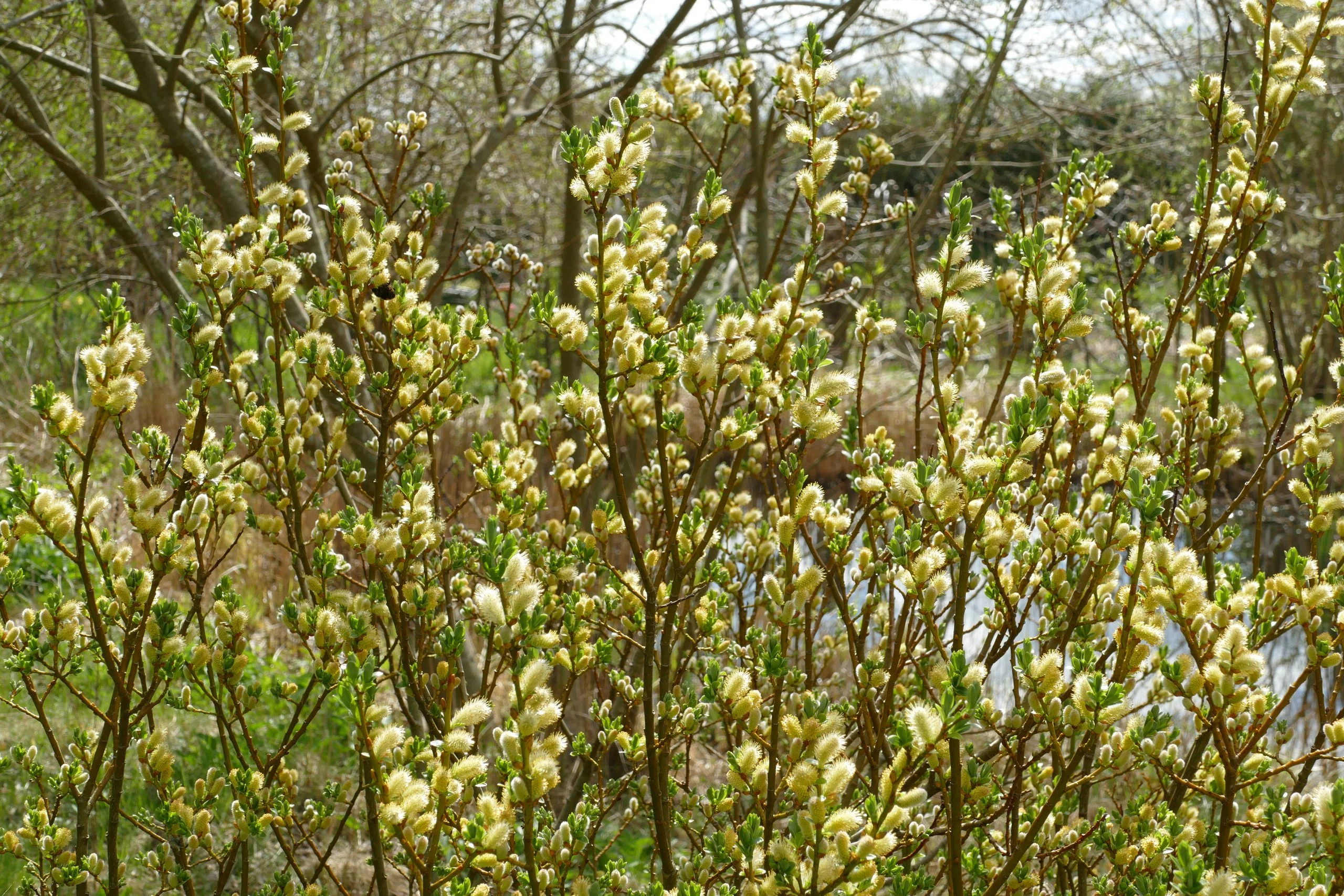 Endlich haben wir 12 Grad und Sonne. Die kleinbleibende Weide Salix bicolor ´Xantha´ ist aufgeblüht. Die Kätzchen locken viele Wildbienen an. Heute habe ich 3 verschiedene Arten gleichzeitig gesehen. Mein Wildbienen-Spezialist schreibt mir hoffentlich noch, welche es waren. So kann ich jedes Jahr neue Wildbienen bestimmen lernen. Nach und nach möchte ich einige davon vorstellen, die Sie auch im eigenen Garten beobachten könnten.