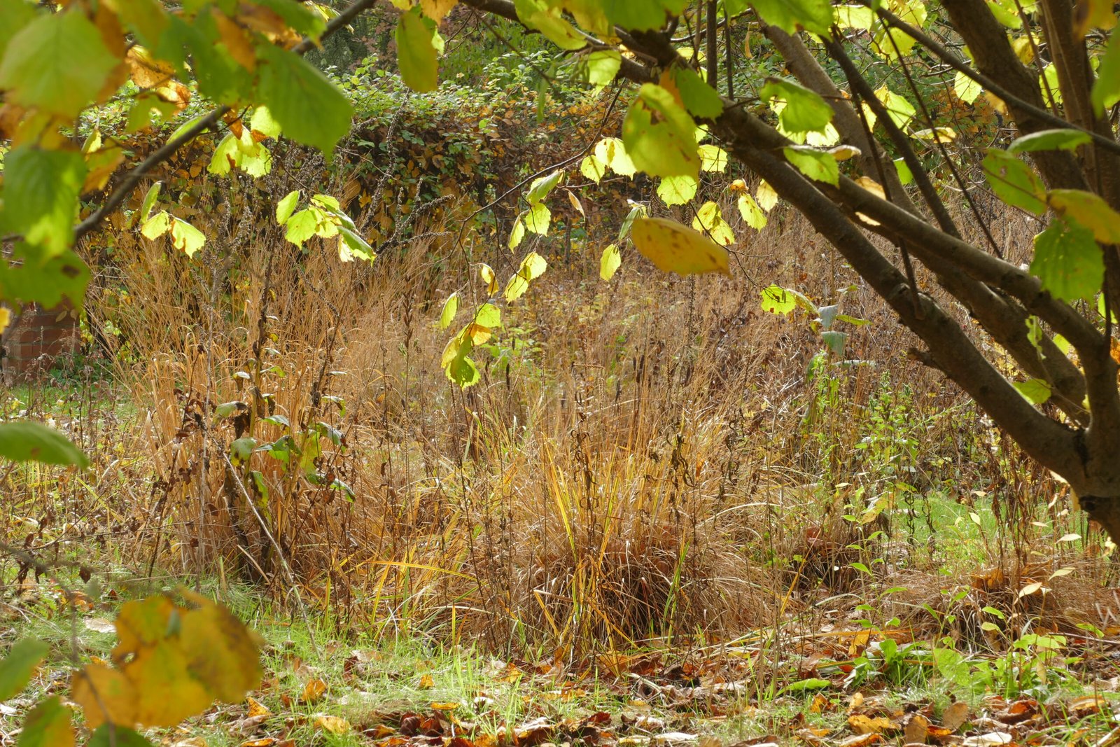 Das längere Gras Molinia arundinacea steht im September/Oktober golden da, die Meisen turnen an den Samenständen, aber beim ersten Schneesturm kippt es leider um und die ganze Show geht wieder von vorne los.